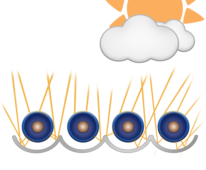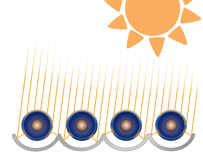 Die CPC Reflektorspiegel zwischen den Vakuumröhren fangen auch diffuse Sonneneinstrahlung ein und reflektieren diese gebündelt im optimalen Winkel auf die Absorberfläche. Somit sind hohe Erträge auch im Winter und bei schlechtem Wetter garantiert.