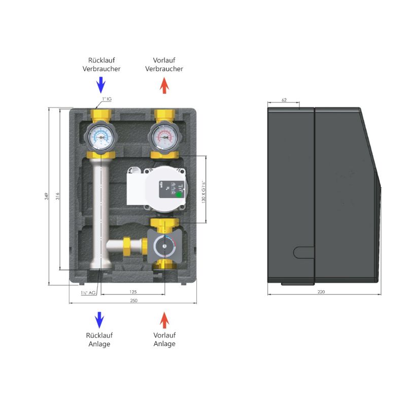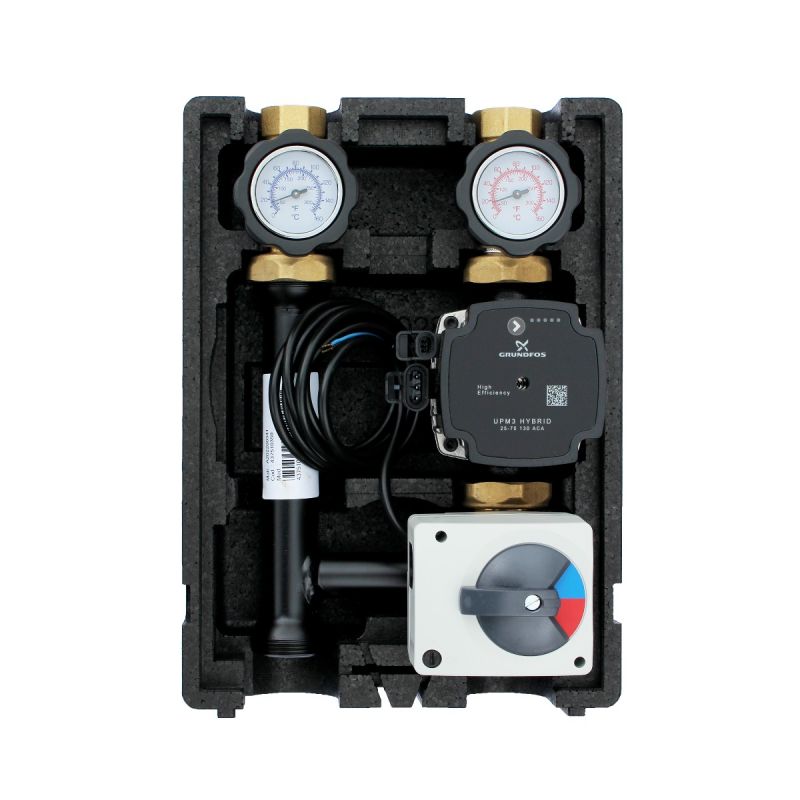 Heizkreispumpengruppe mit Drei-Wege-Mischer, ELODRIVE ST10 Stellmotor und GRUNDFOS UPM3 HYBRID 25/7 Hocheffizienzpumpe, inkl. Wandhalterung